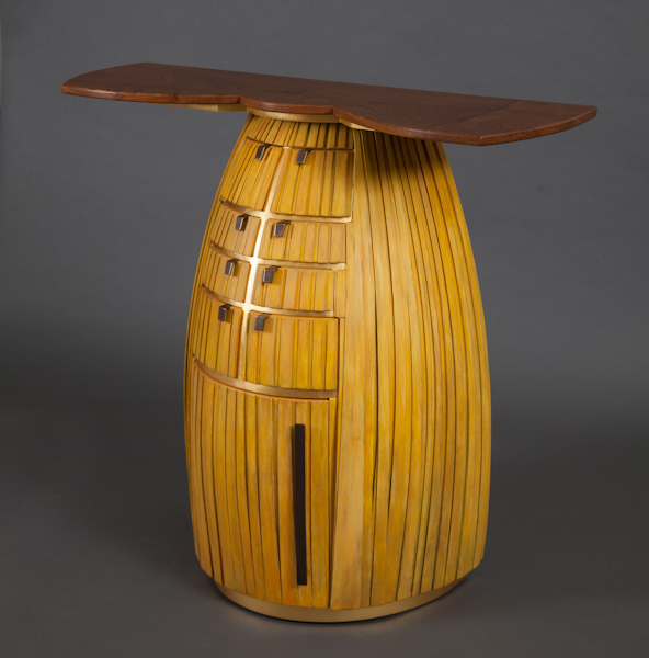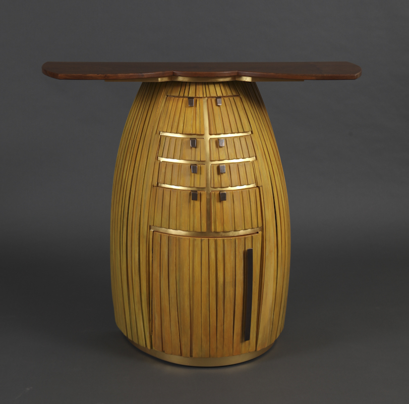 View the full image Bow Teak View the full image Bow Teak Teak, Redwood, Euro Beech, oxidized Bronze-plated Brass, oil paint, 24K Gold leaf 36 5/8" x 40" x 16" 2012