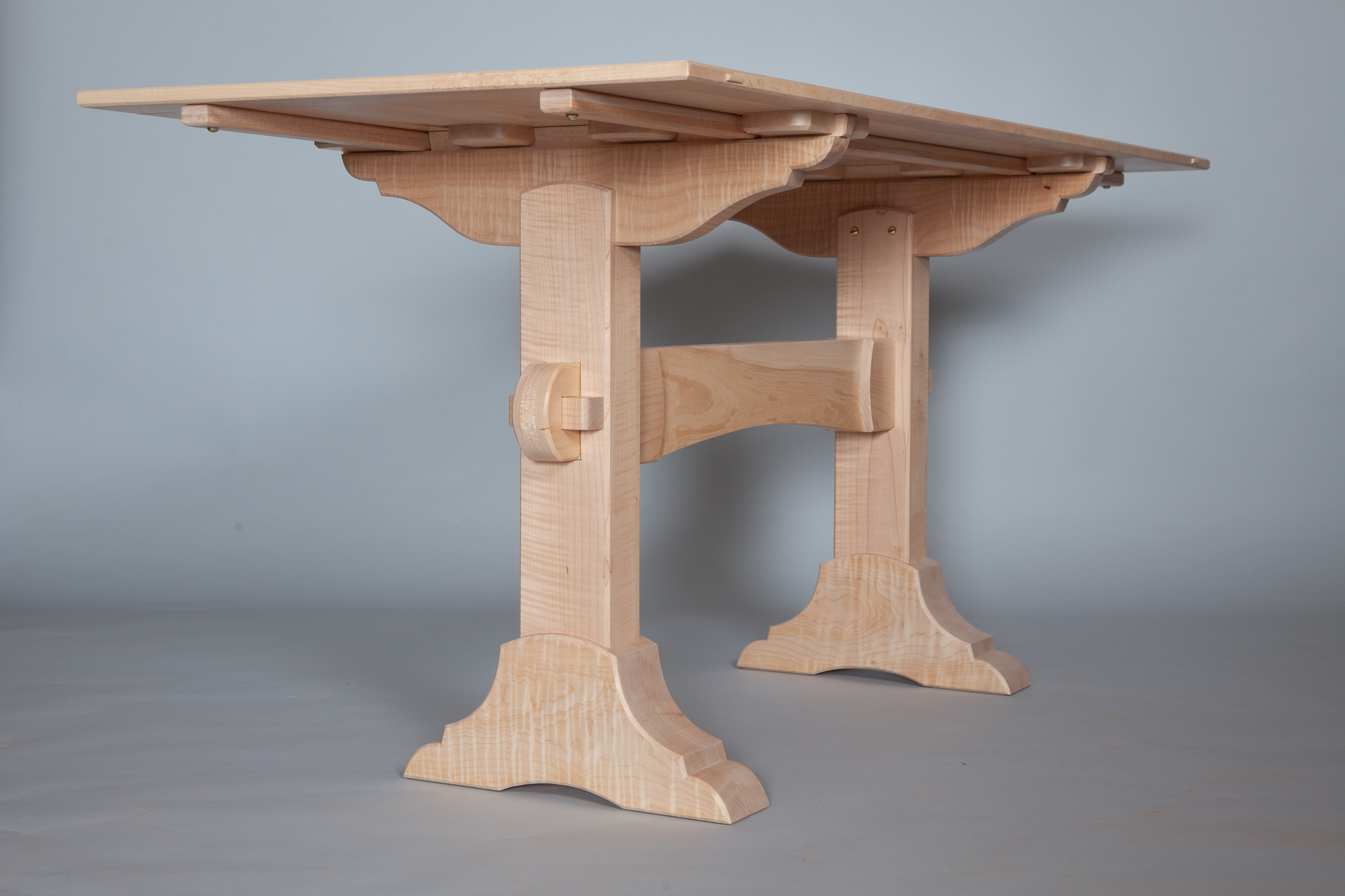 View the full image Trestle Table View the full image Trestle Table View the full image Trestle Table with Built-in Bench Maple, Curly Maple, Rosewood/Maple Inlay, Plywood, Naugahyde upholstery, 29" x 62" x 28" 2022